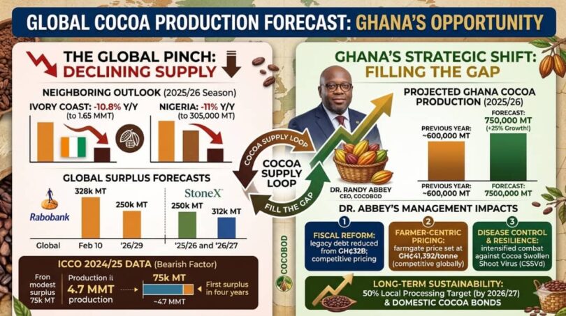 As global supply plummets, Ghana is not just “stepping in”—it is leading the way. Through a combination of fiscal discipline, farmer-centric pricing, and aggressive disease control (tackling the Swollen Shoot virus), Dr. Randy Abbey has positioned Ghana to be the reliable backbone of the world’s chocolate industry.